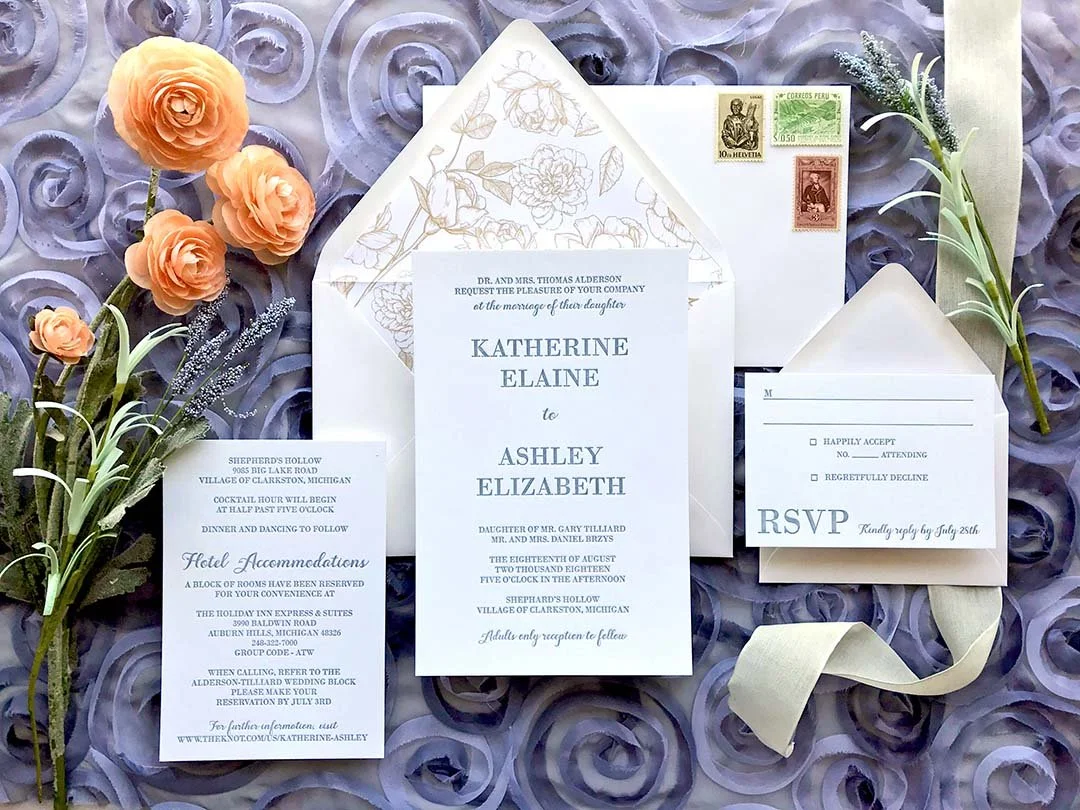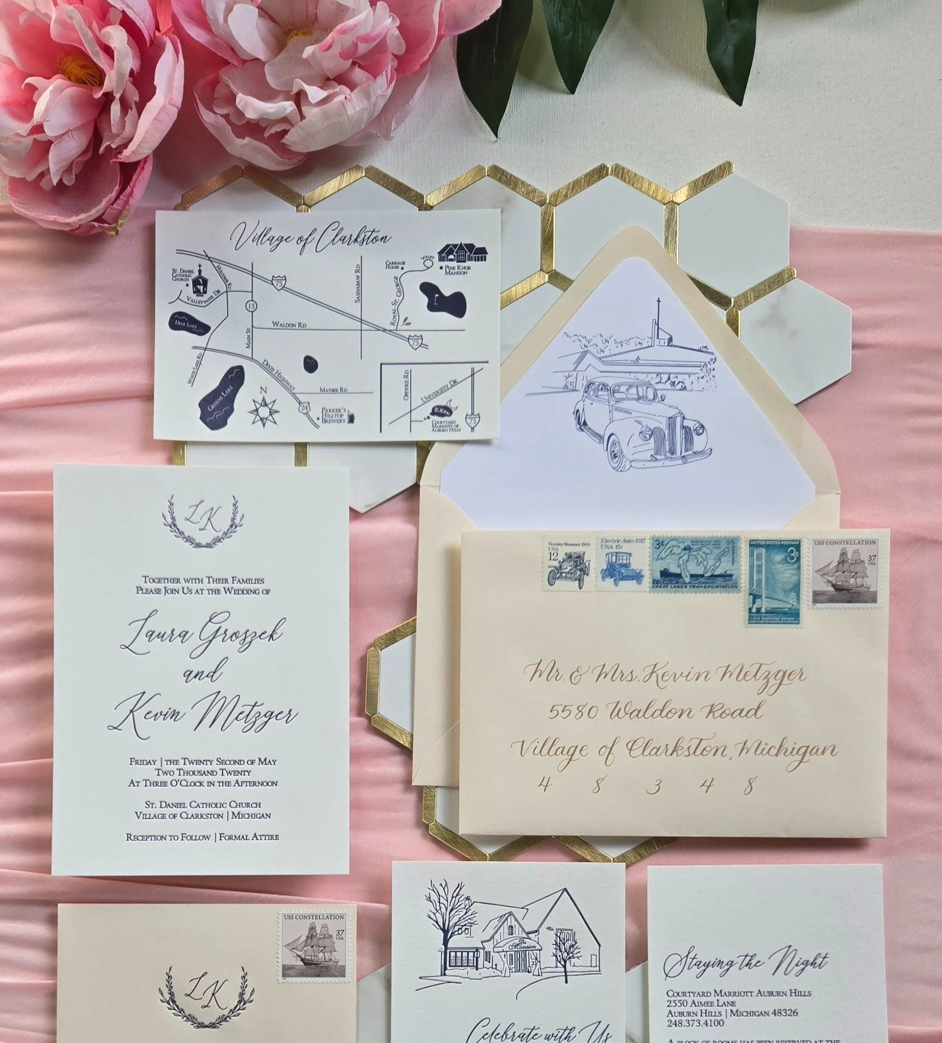This stunning letterpress wedding suite is packed with extra personalizations and touches by the couple. There is a custom monogram on the invitation card, a custom map of the venue city complete with church, reception, and hotel locations, illustrations of their church, vintage car, and historic mansion reception site, guest addresses in gold calligraphy, and vintage postage in a blue palette giving homage to their home sate (and mine) of Michigan.